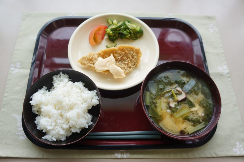 ごはん,県産おさかなフライ,やまうにソース,きゅうりとブロッコリーのサラダ,トマト,まなべ汁