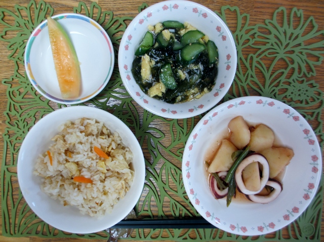 打ち豆入りかやくごはん、じゃがいもとイカの照り煮、きゅうりの酢の物、プリンスメロン