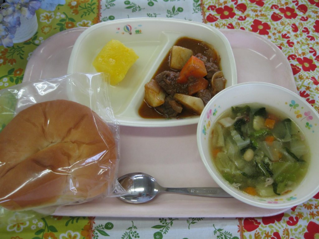 うずまきパン、ゴロゴロビーフシチュー、まめ豆ふくいのスープ、パインアップル