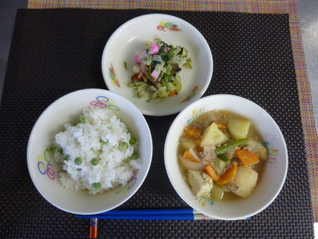 えんどうご飯、じゃがいものそぼろ煮、梅肉和え