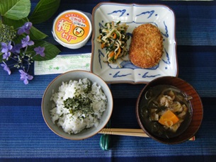 ぼっかけ汁、若狭牛コロッケ、おひたし、もみわかめ、梅ゼリー