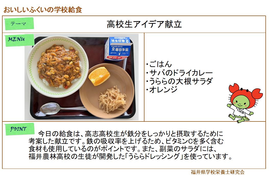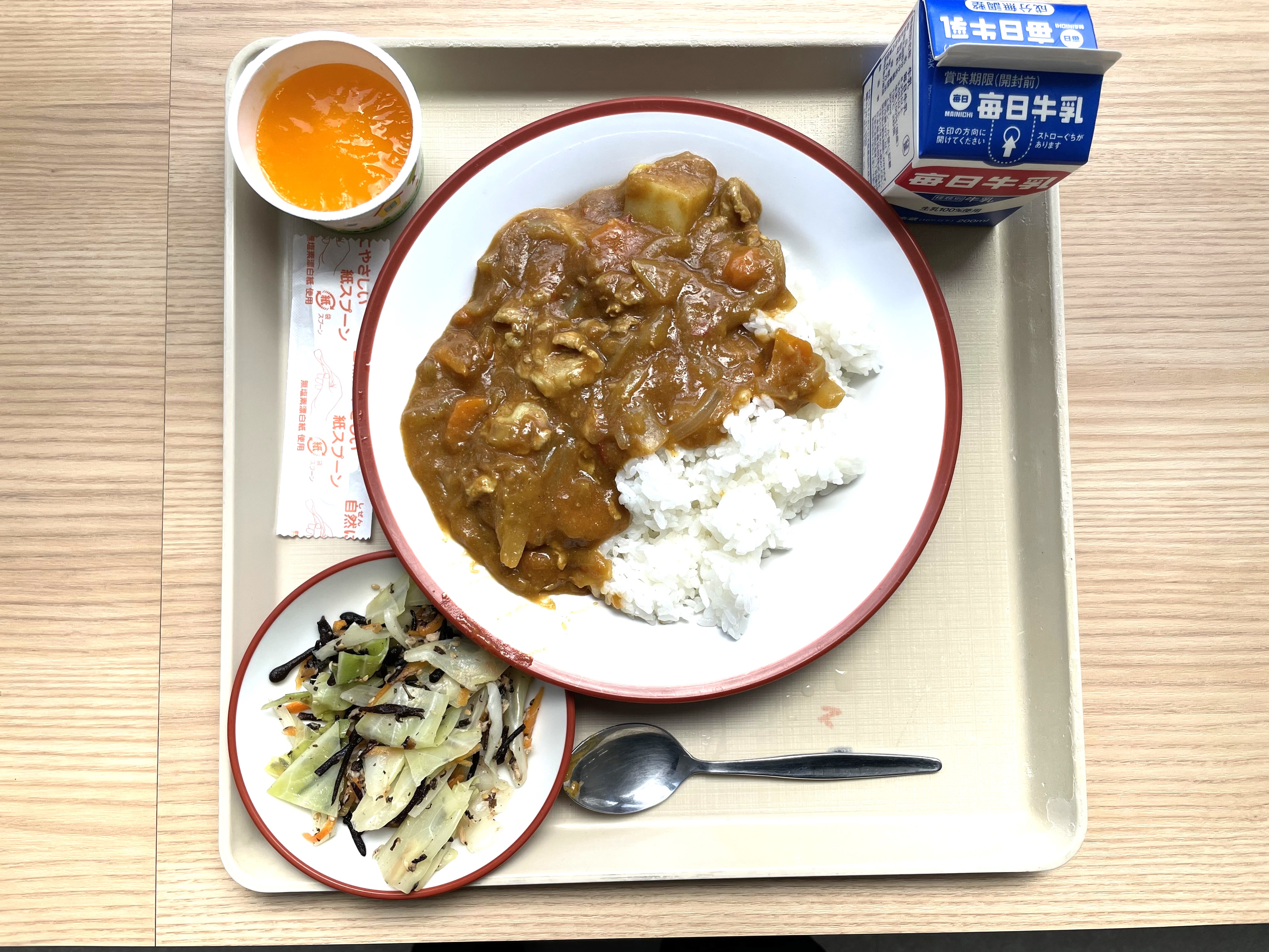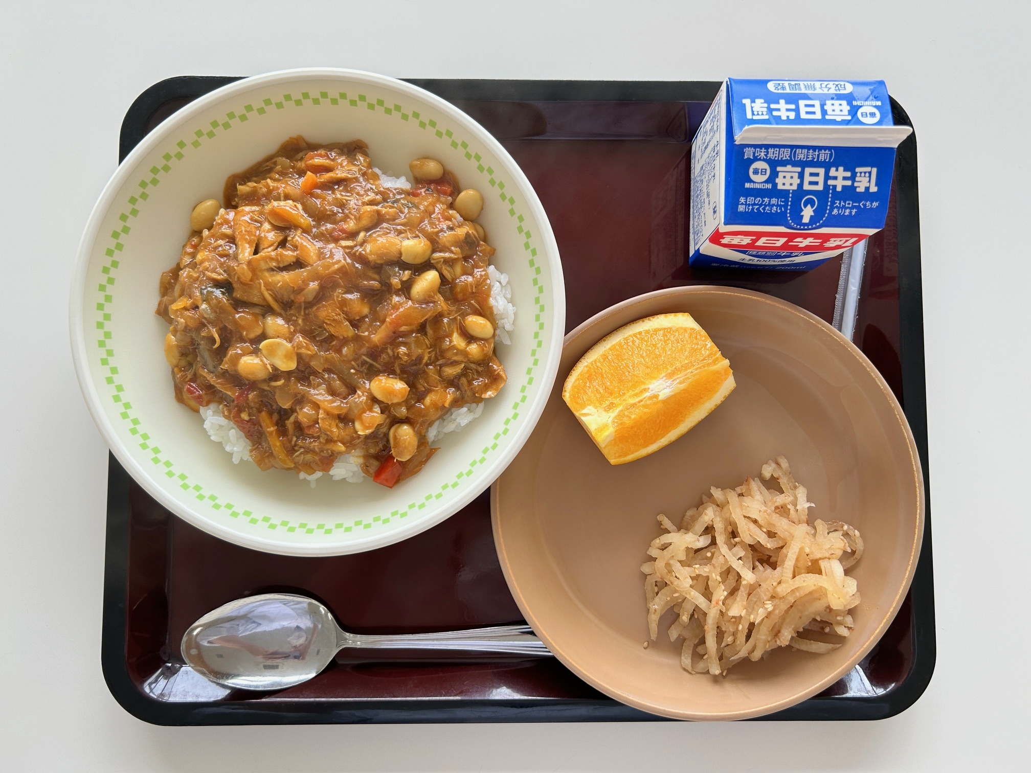 ごはん,サバのドライカレー,うららの大根サラダ,オレンジ