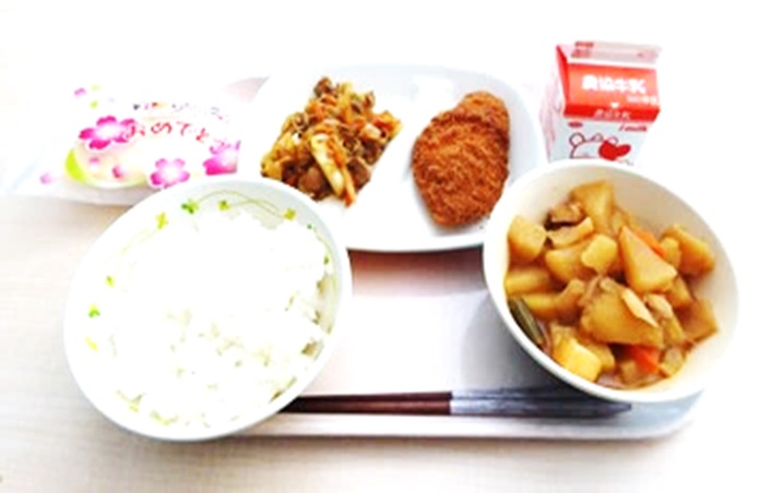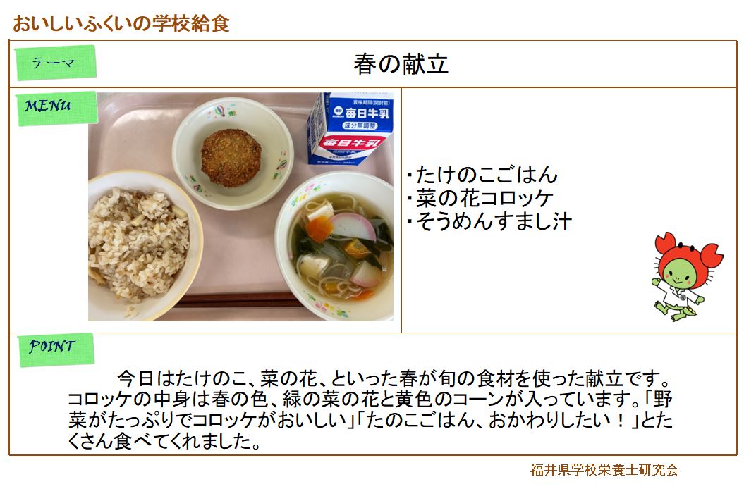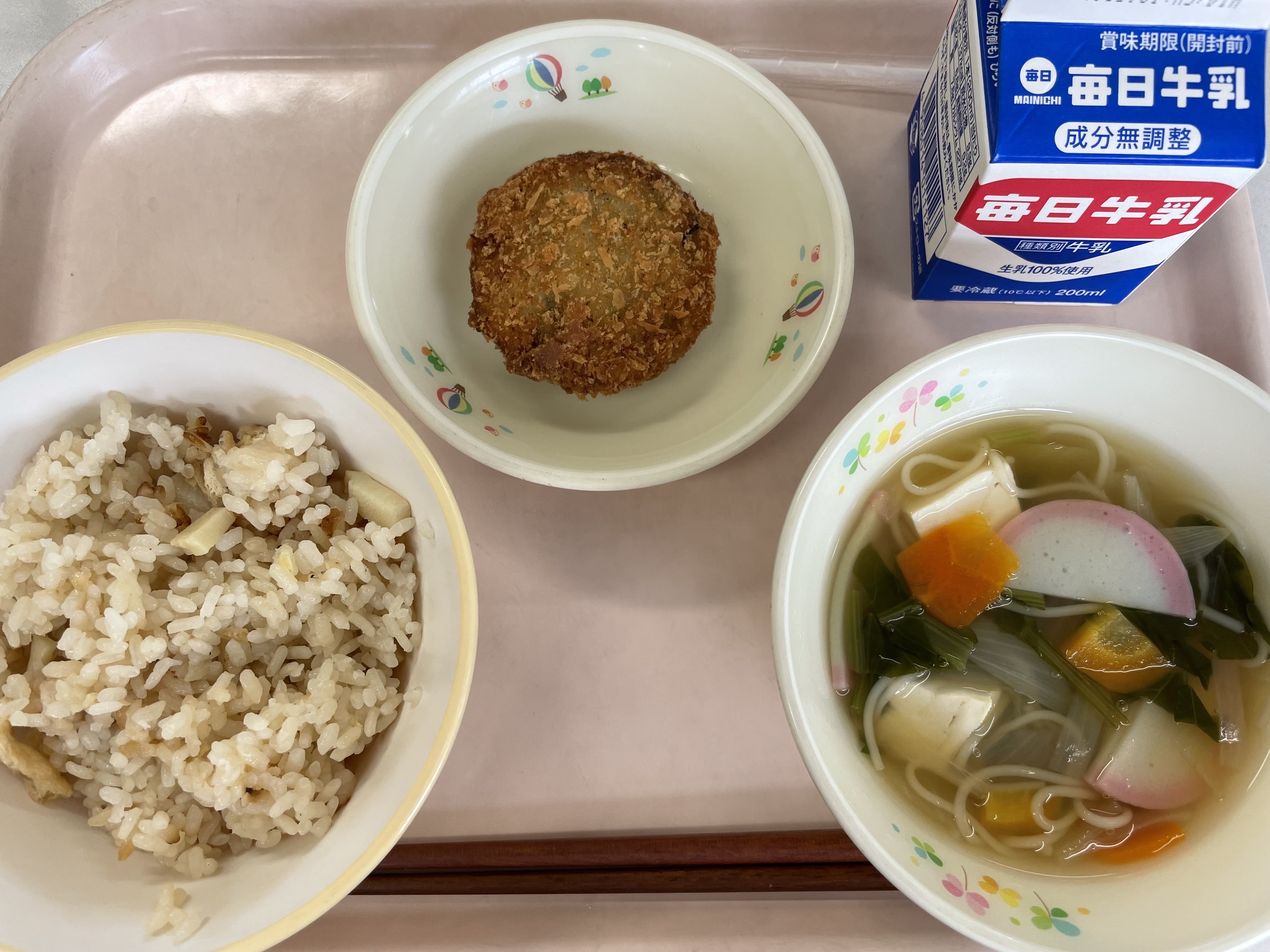 たけのこごはん、菜の花コロッケ、そうめんすまし汁