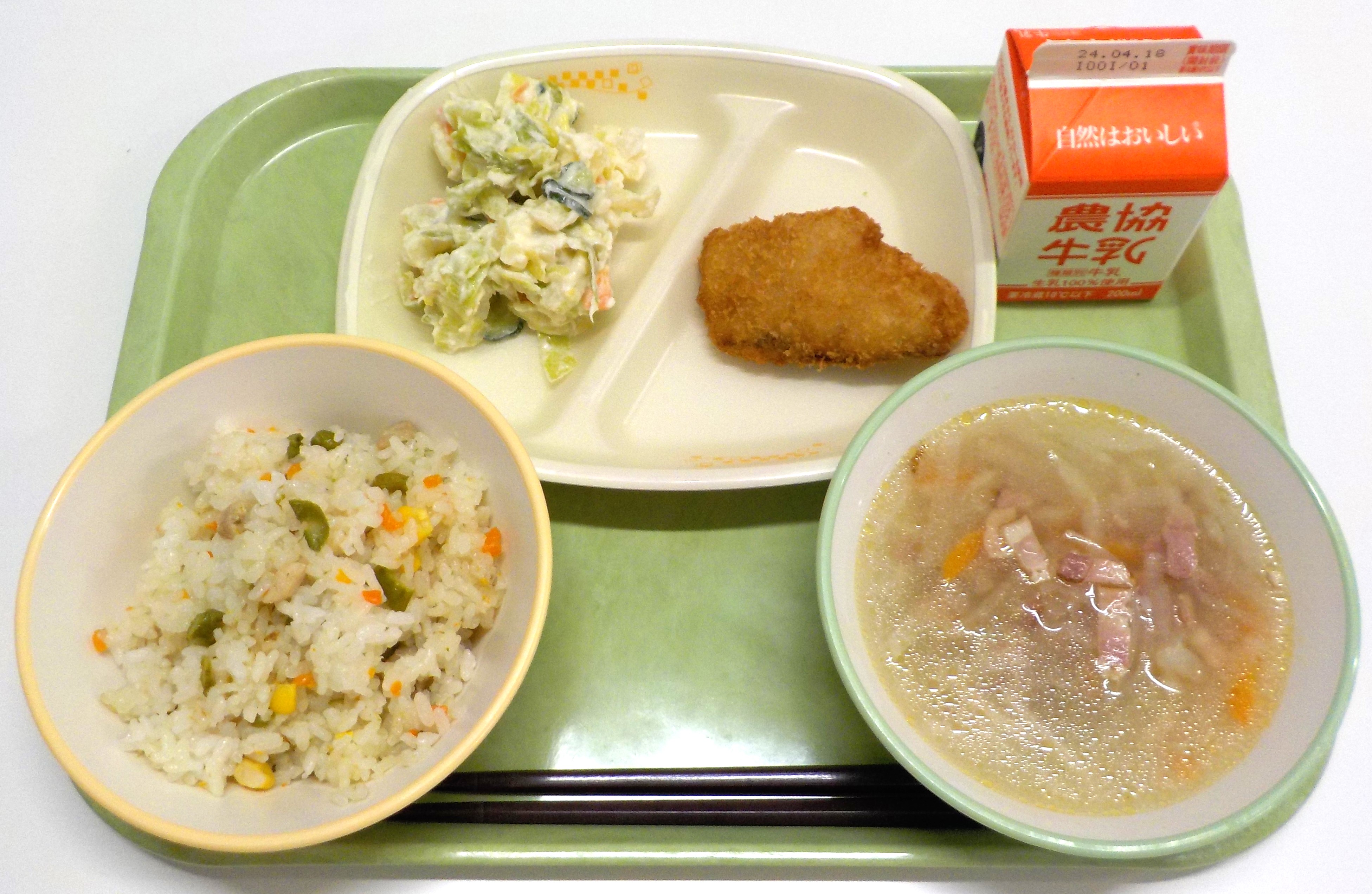 アスパラガスとコーンのピラフ,たらのフライ,ポテトサラダ,ジュリアンスープ