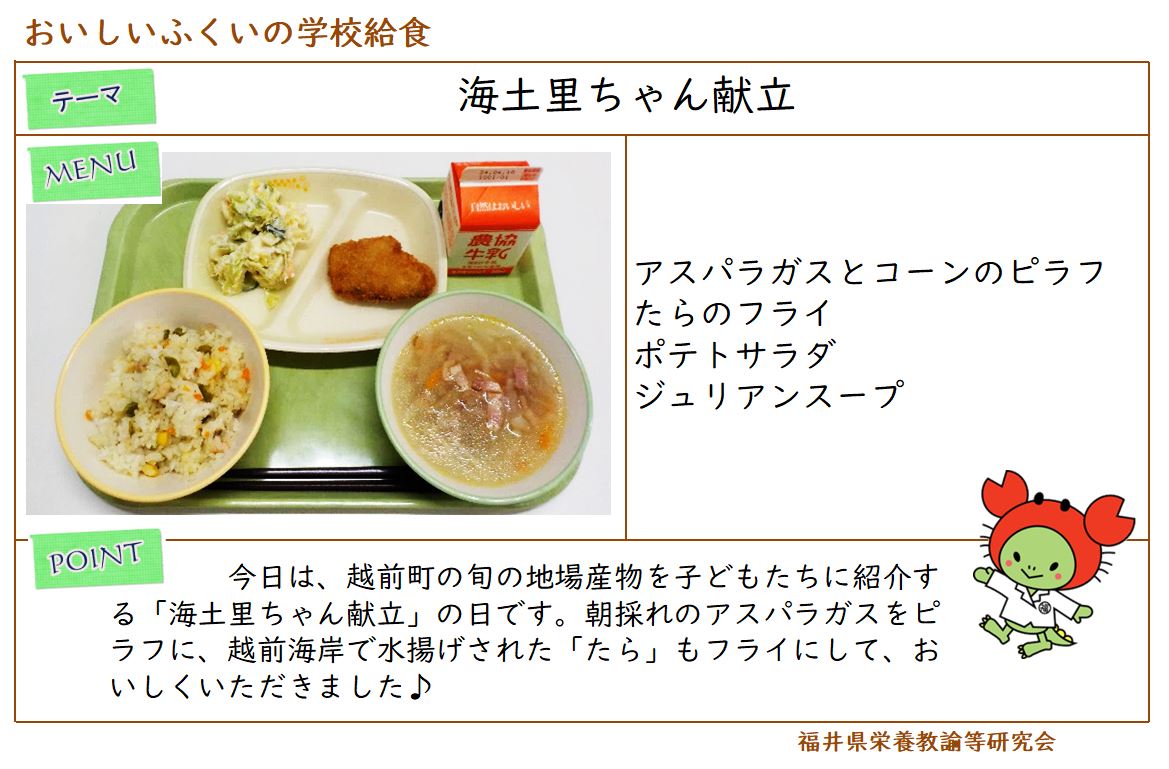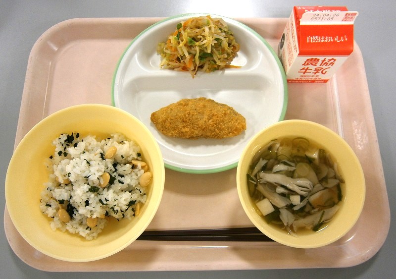 大豆入りわかめご飯,サゴシのフライ,春キャベツのおひたし,ふるさとすまし汁