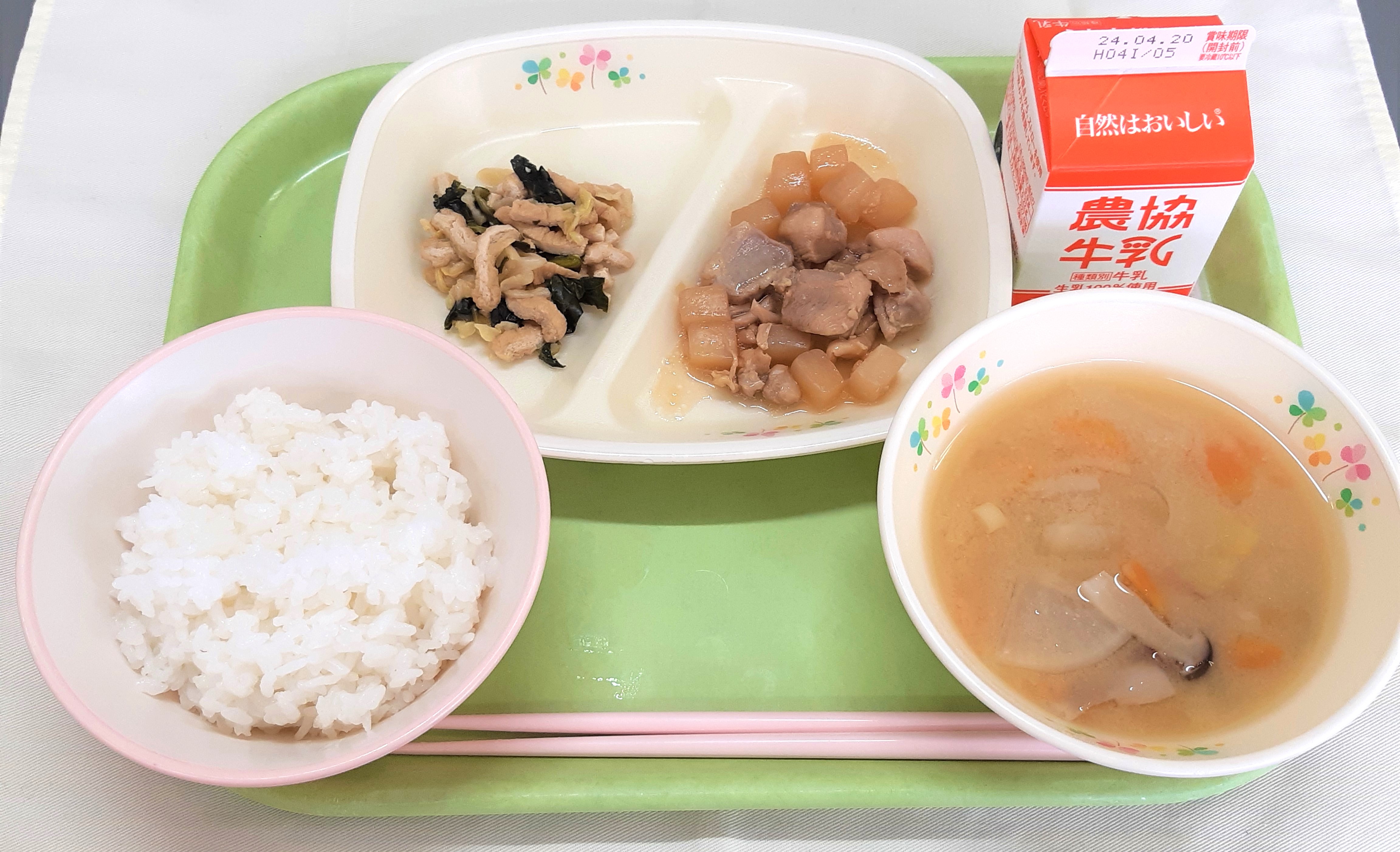 ご飯、鶏肉のさっぱり煮、青菜の煮浸し、野菜のみそ汁