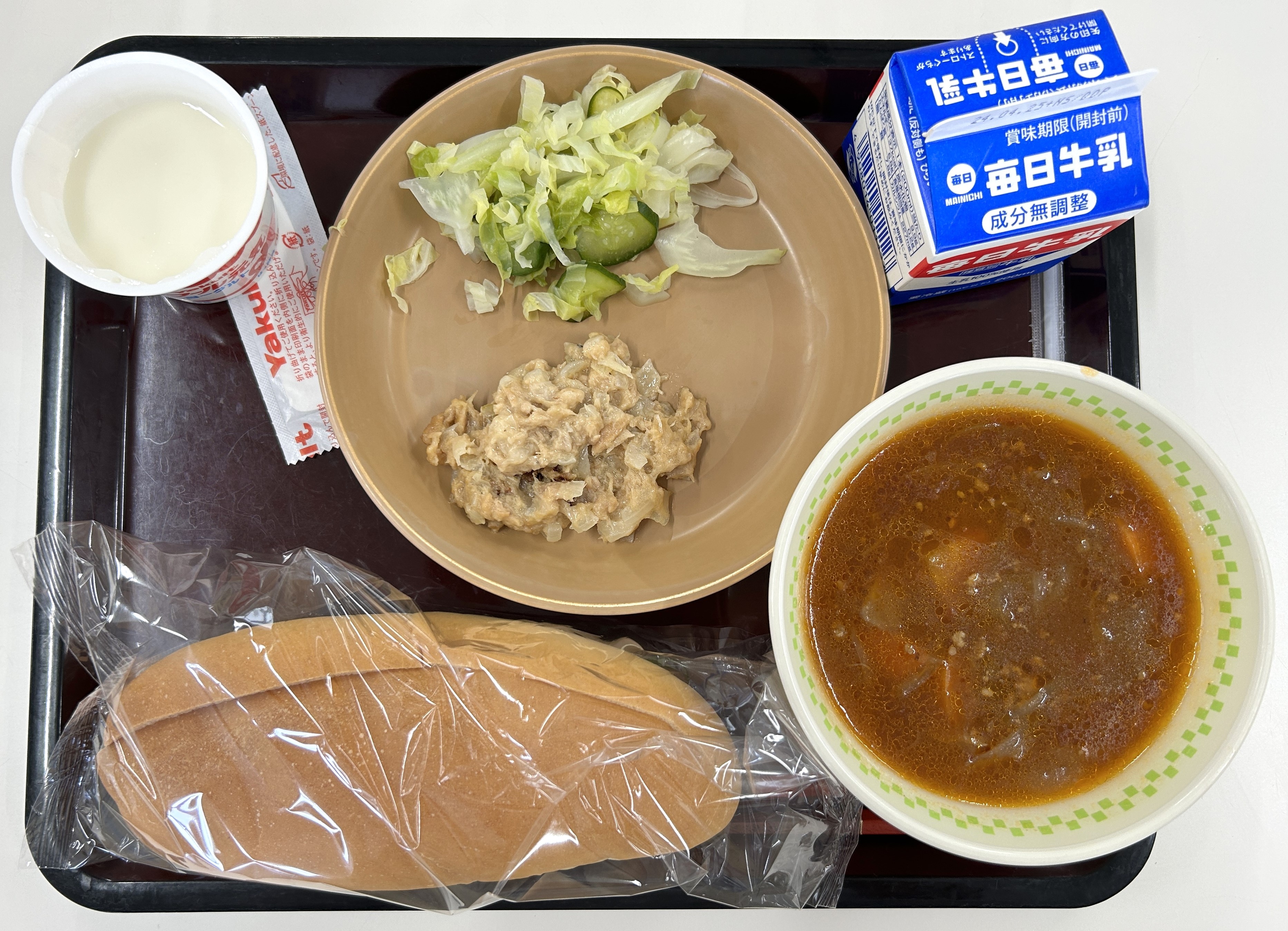 コッペパン、ツナサンドの具、レーズンサラダ、じゃがいものデミグラス煮込み、ヨーグルト