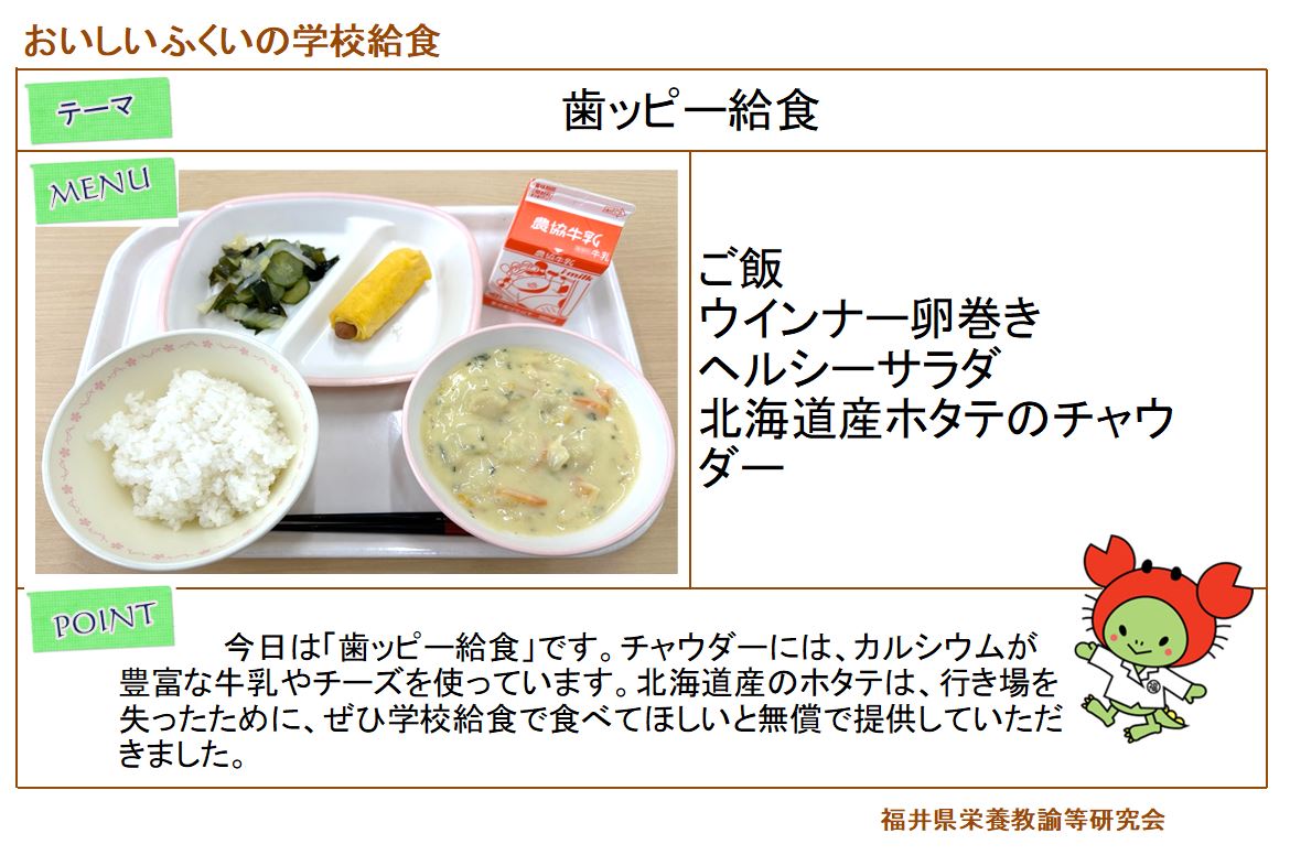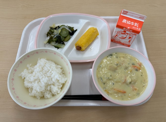 ご飯、ウインナー卵巻き、ヘルシーサラダ、北海道産ホタテのチャウダー