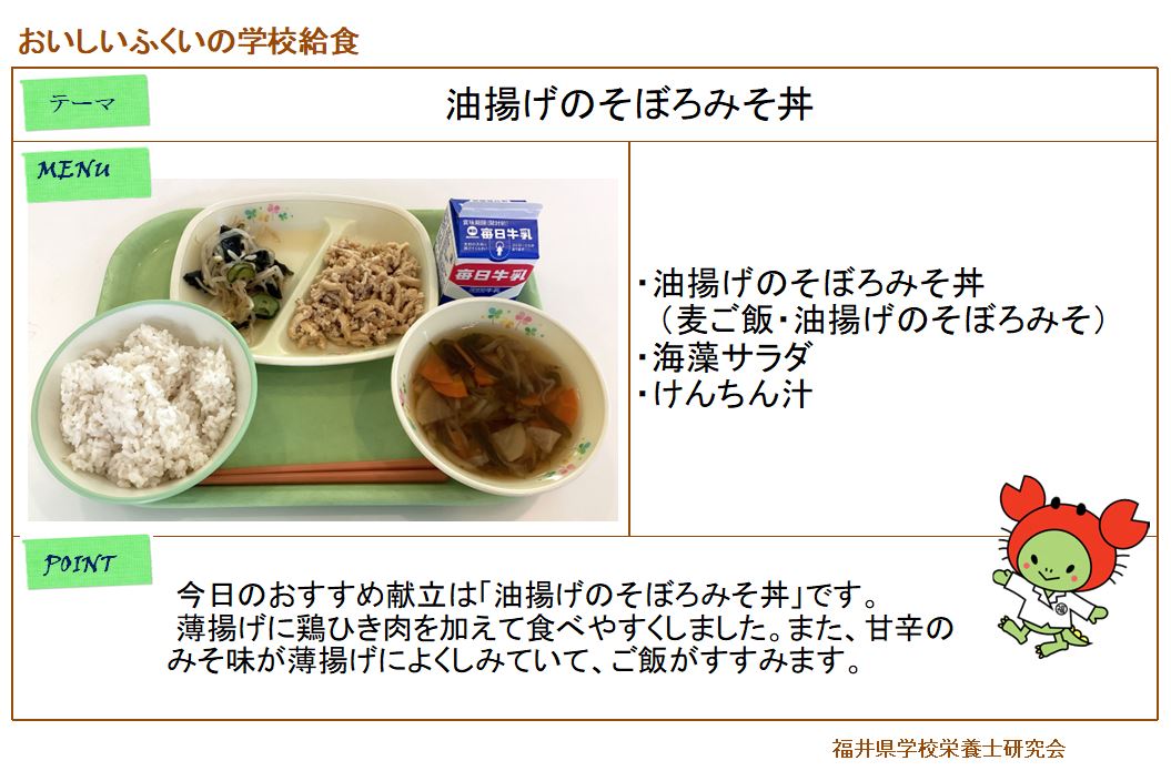 油揚げのそぼろみそ丼(麦ご飯・油揚げのそぼろみそ)海藻サラダ、けんちん汁