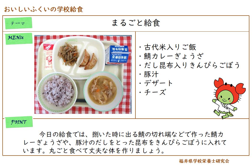 古代米入りご飯、鯖カレーぎょうざ、だし昆布入りきんぴらごぼう、豚汁、デザート、チーズ