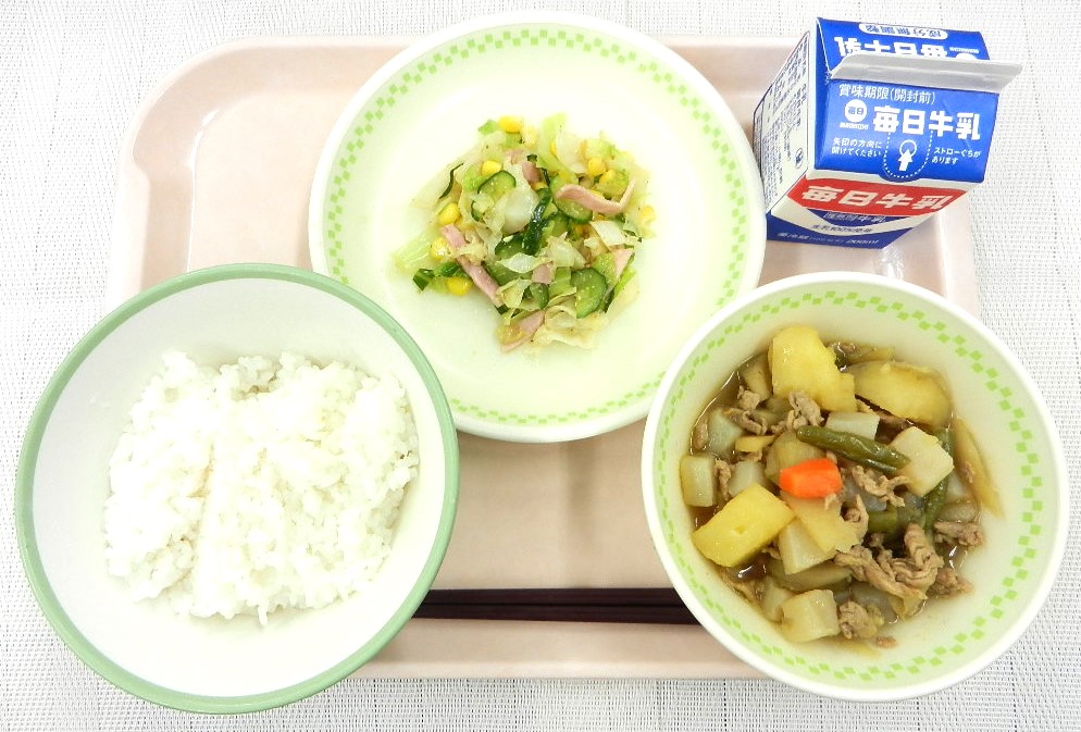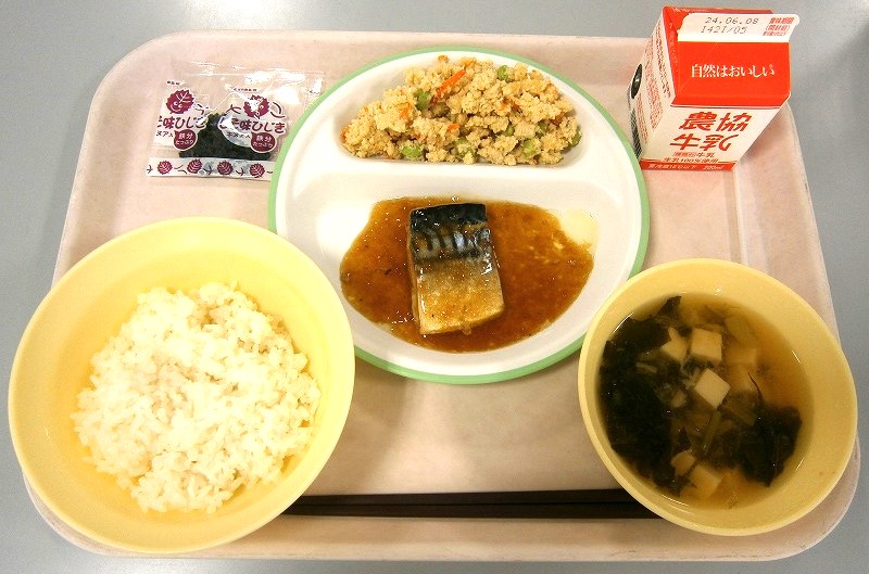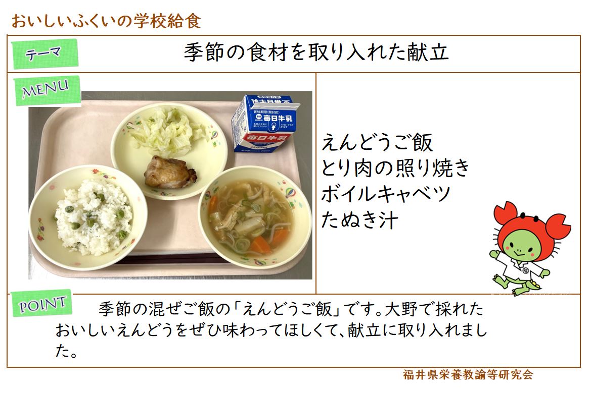えんどうご飯、とり肉の照り焼き、ボイルキャベツ、たぬき汁