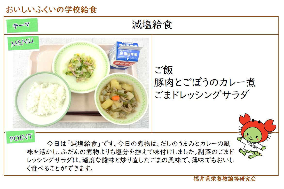 ご飯、豚肉とごぼうのカレー煮、ごまドレッシングサラダ