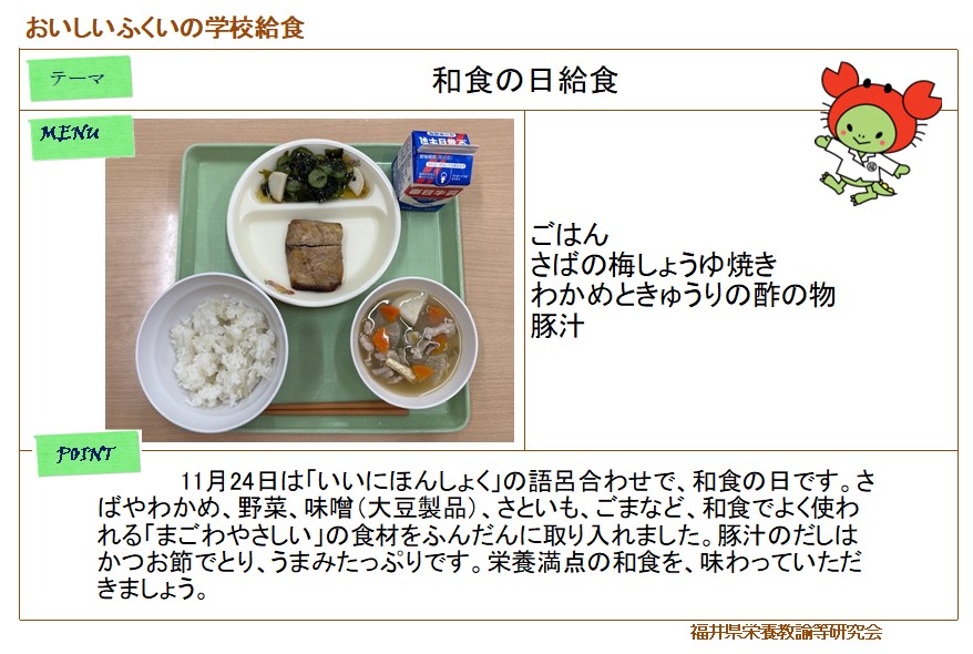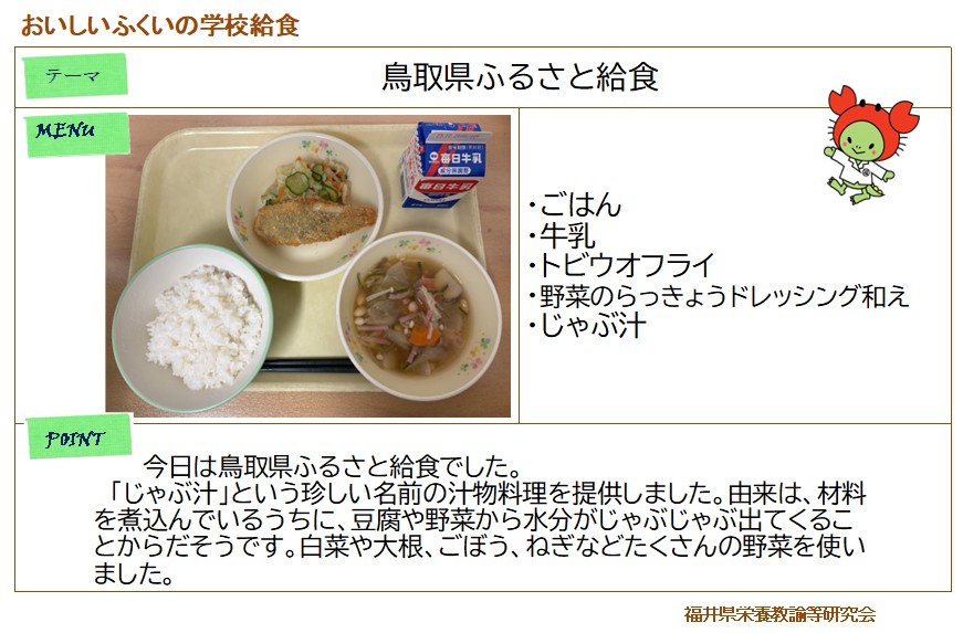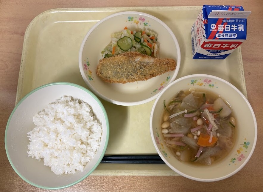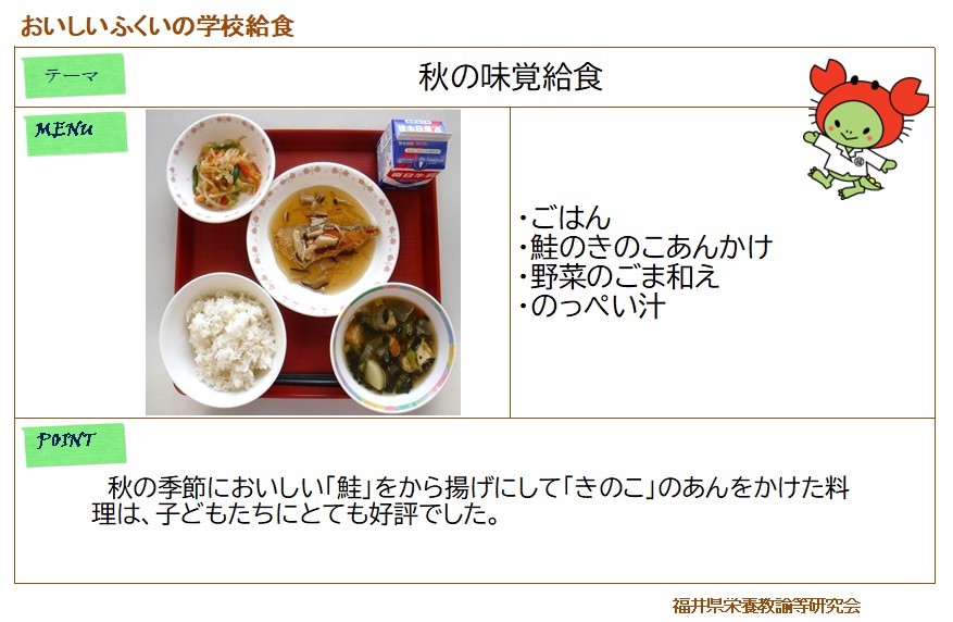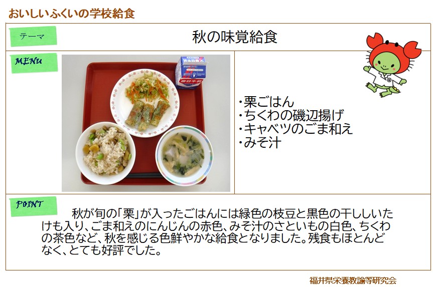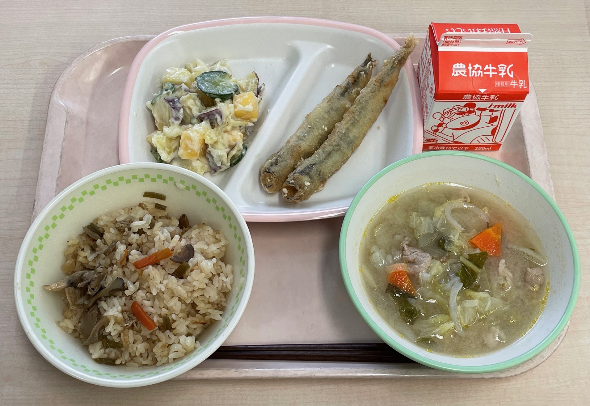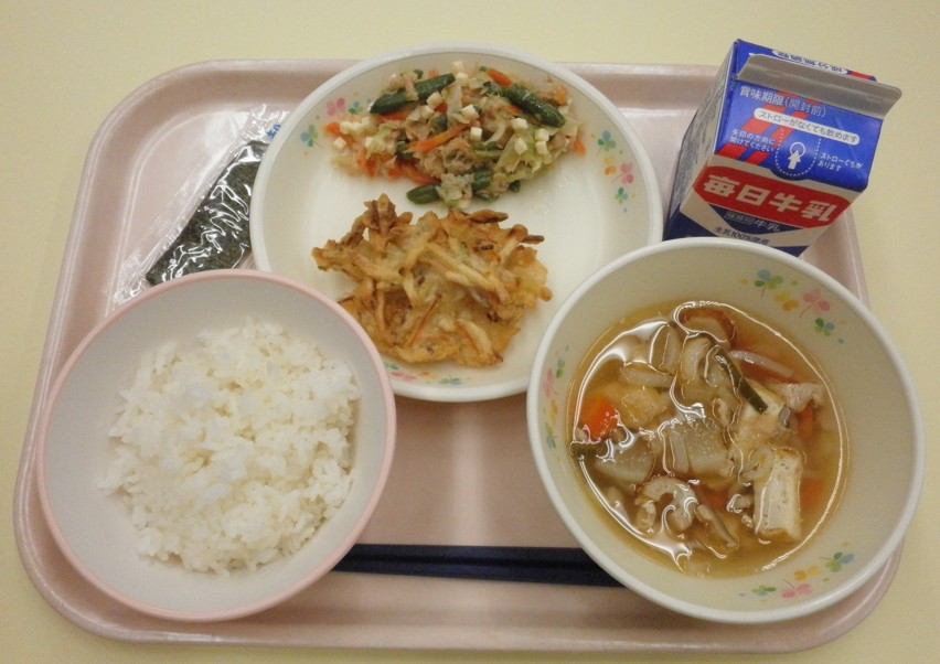 白茎ごぼうごはん、ししゃもの天ぷら、越前柿入りミックスサラダ、豚汁