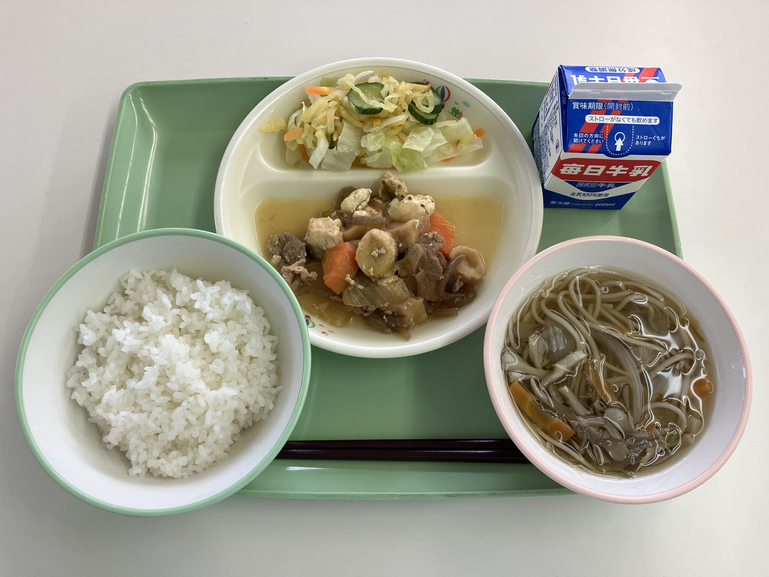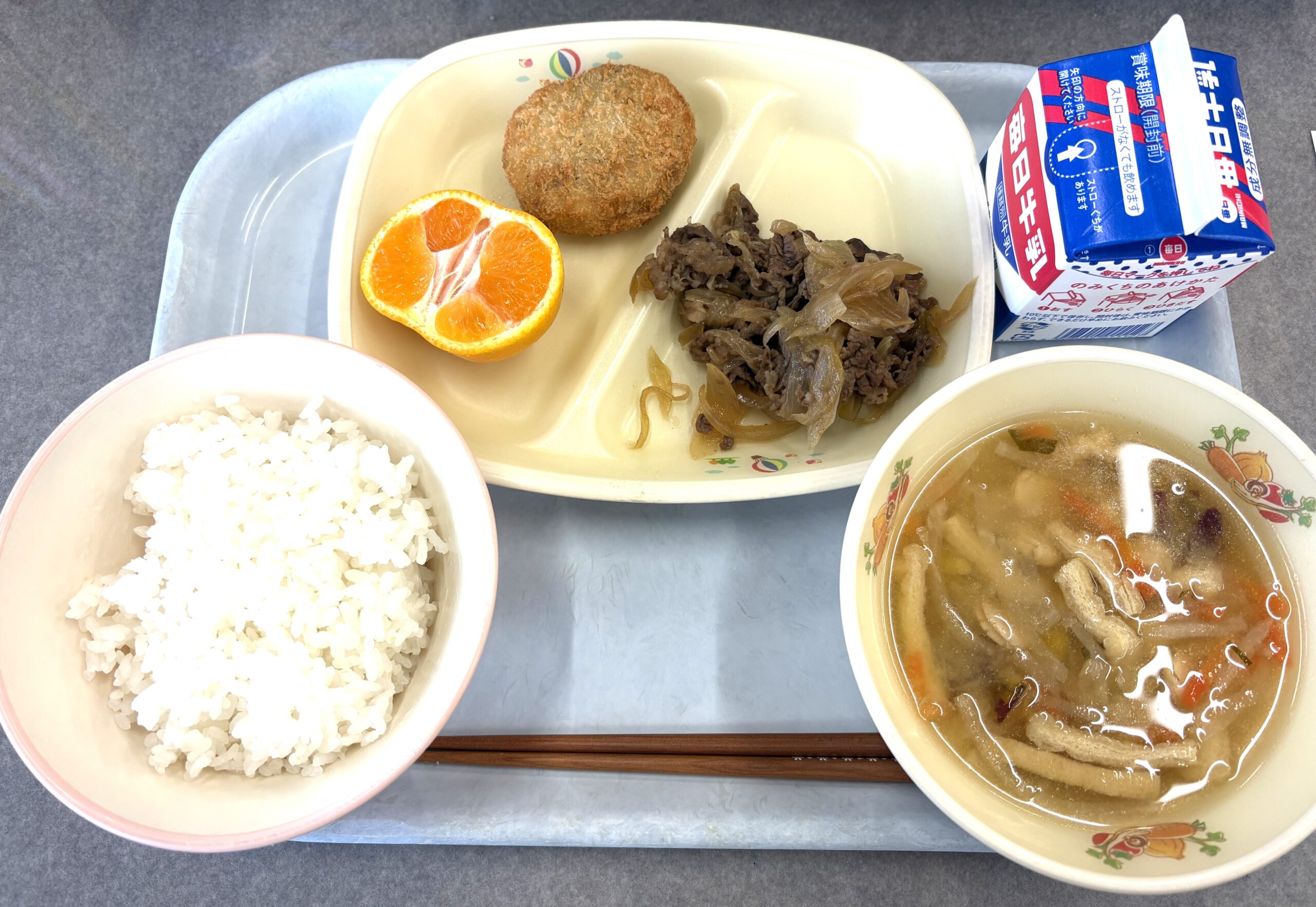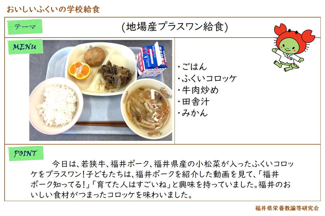 ごはん、ふくいコロッケ、牛肉炒め、田舎汁、みかん