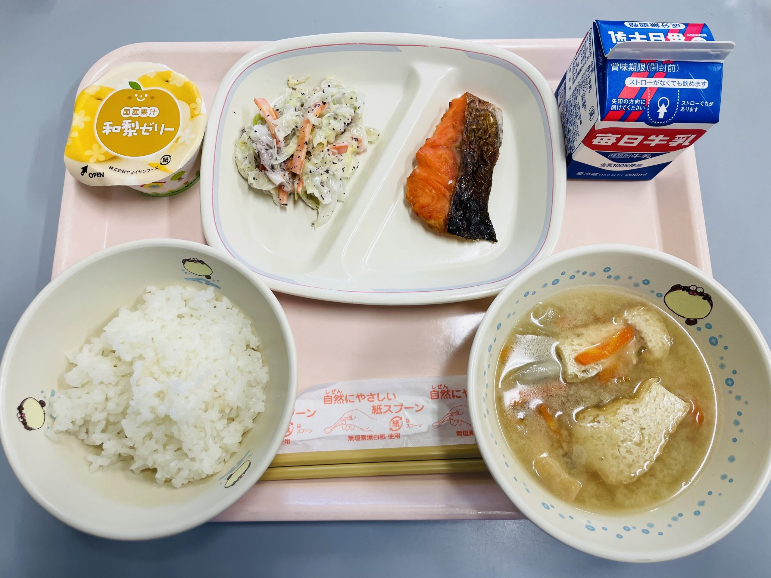 ごはん、ふくい名水サーモンの塩焼き、梅マヨ和え、厚揚げと玉ねぎのみそ汁、国産和梨ゼリー