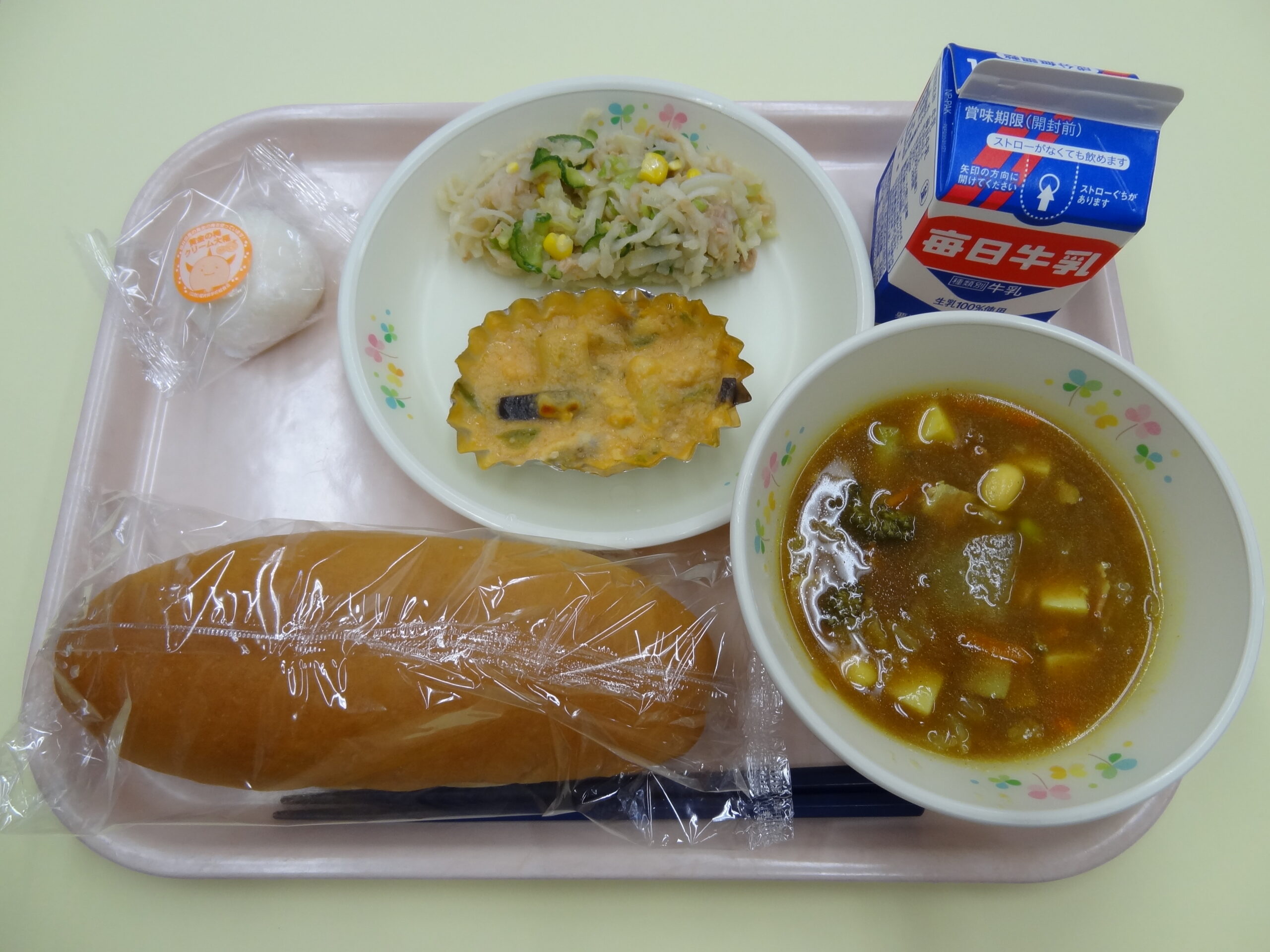 コッペパン、山海里野菜のカップ焼き、越のルビードレッシングサラダ、豆まめカレースープ、黄金の梅クリーム大福