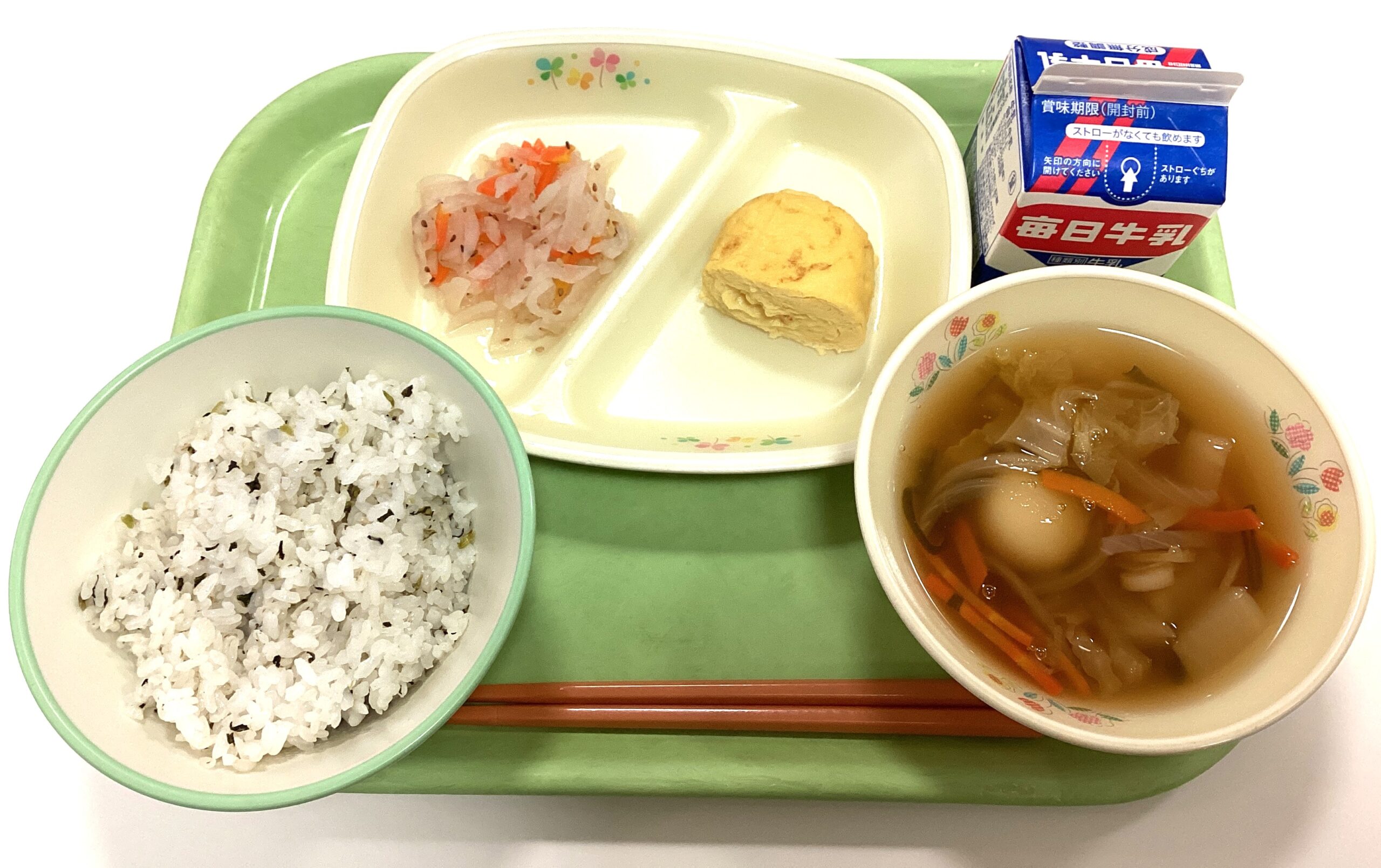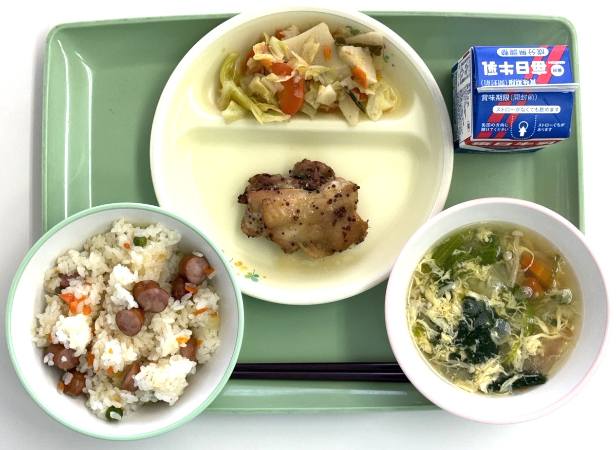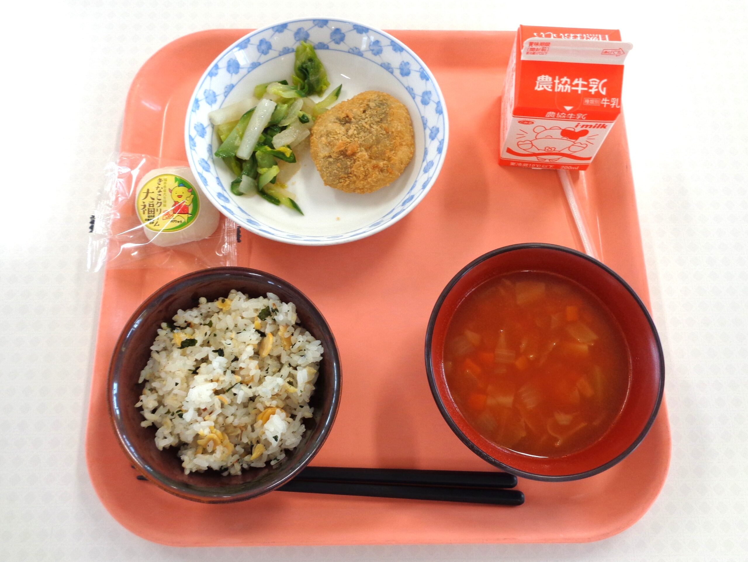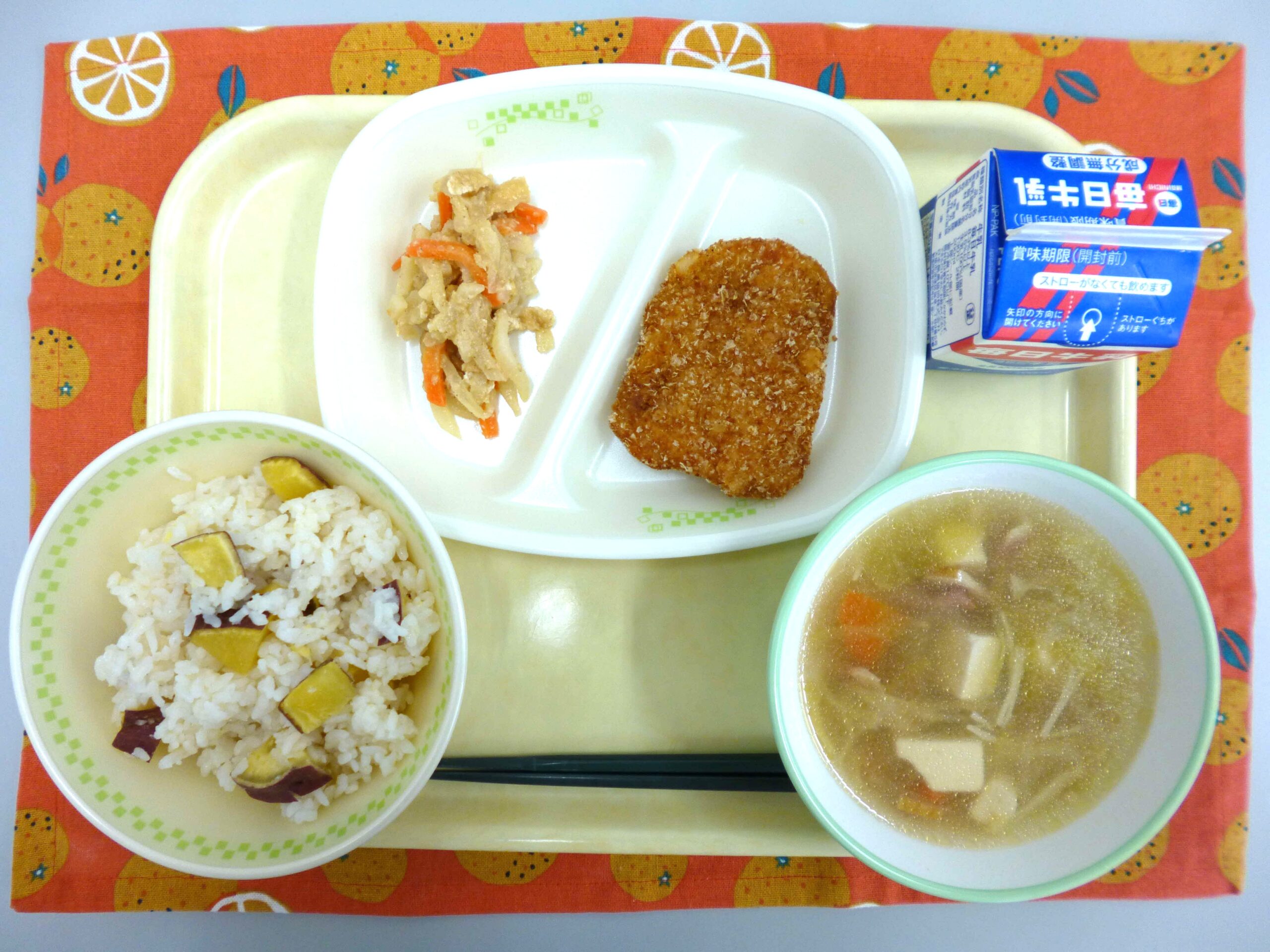 さつまいもご飯、ポテトとお米のささみカツ、長寿なます、豆腐のスープ