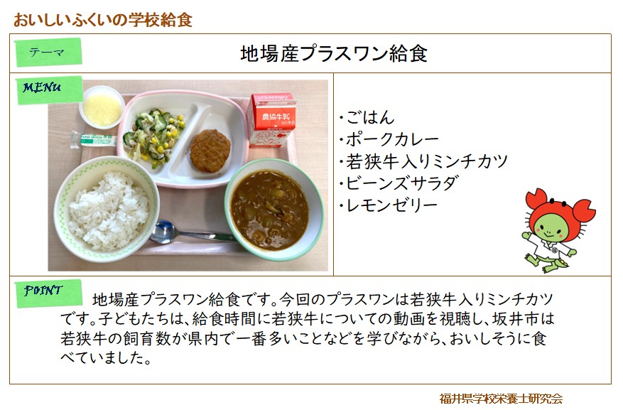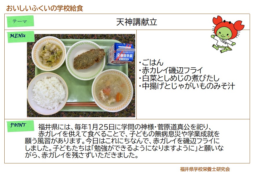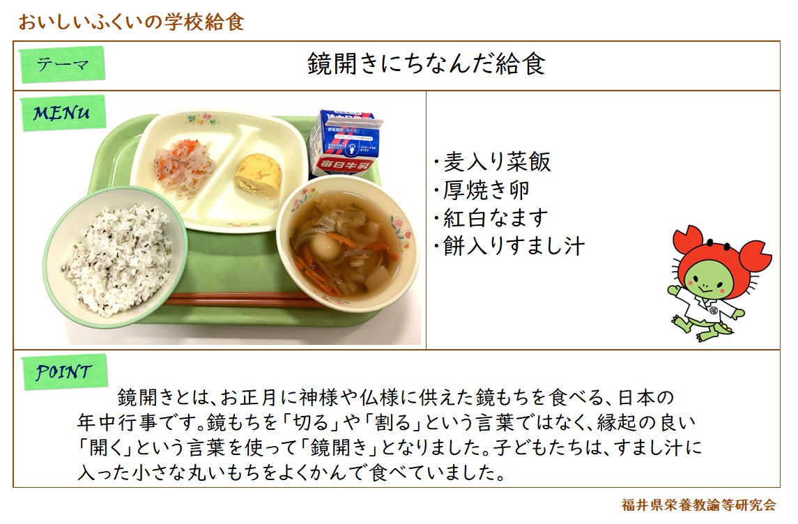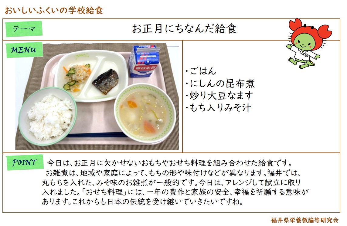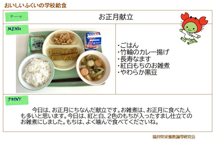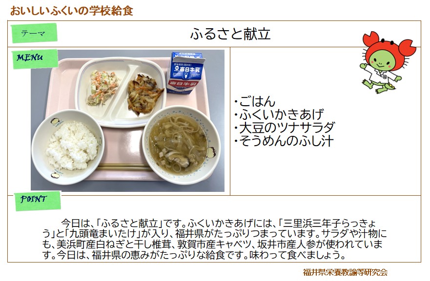 さつまいもご飯、ポテトとお米のささみカツ、長寿なます、豆腐のスープ