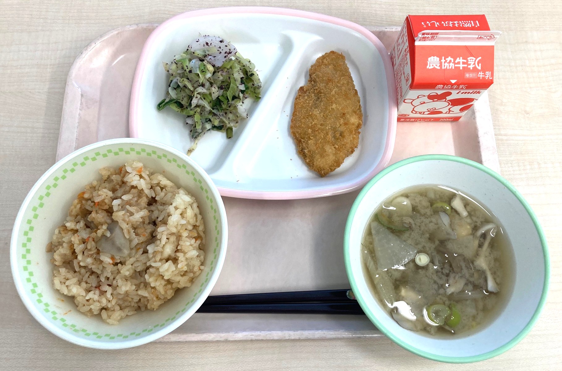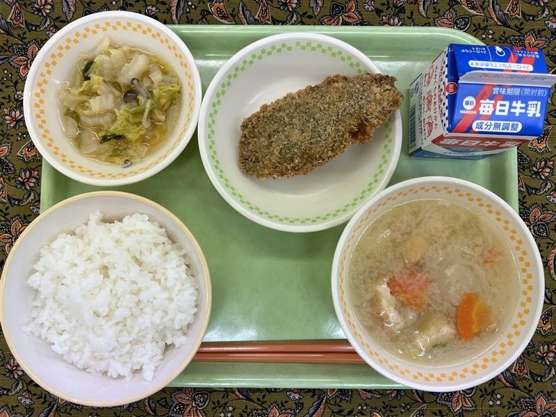 ごはん、赤カレイ磯辺フライ、白菜としめじの煮びたし、中揚げとじゃがいものみそ汁