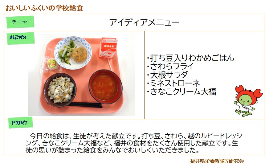打ち豆入りわかめごはん、さわらフライ、大根サラダ、ミネストローネ、きなこクリーム大福