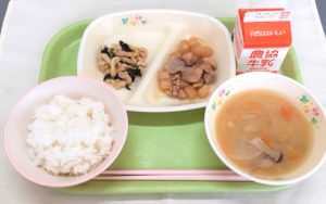 麦ごはん、 小揚げの含め煮、 野菜のうらら和え、 かぶのみそ汁、 味付けのり