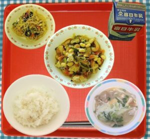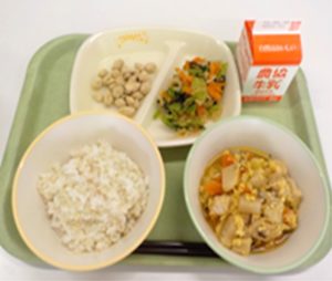 麦ご飯、 こおり豆腐の卵とじ煮、 青菜のはりはり漬け、 豆っこ新ちゃん
