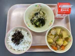 ごはん、 じゃがいもの鶏そぼろ煮、 もやしとわかめの酢の物、 手作りひじきふりかけ