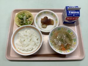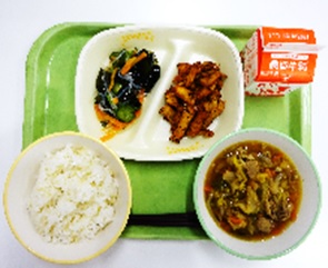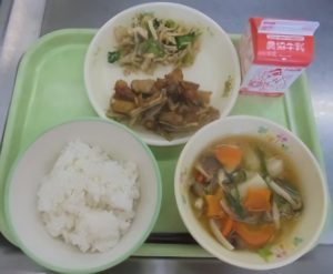 まいたけごはん、 鶏肉のらっきょうがらめ、 野菜のごま和え 、 具だくさん汁