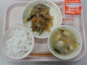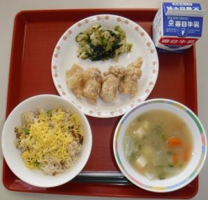 ごはん(いちほまれ)、 県産かますの塩こうじから揚げ、 大根のきんぴら、 小松菜のみそ汁