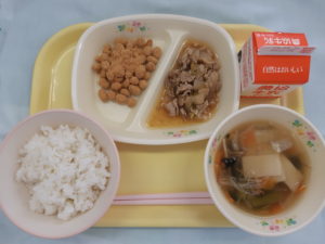 ごはん、 豚肉の香味ソース炒め、 ワンタンスープ、 きなこ豆